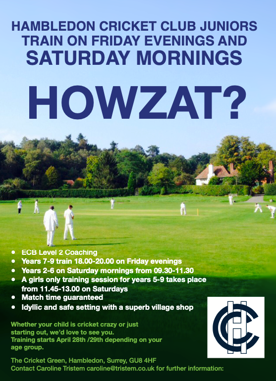 The new cricket season starts with a win, win…. The first seniors match on Sun 8 May, at home against Bramley, culminated in a well-earned win for Hambledon against traditionally strong opposition. Inclement weather on Sun 15 May regrettable put paid to the chance of building on this success, but hopefully the weather will be kind to us in the coming weeks and please do come down and support us. The full fixture list for June and July is below. Readers will note that the Mary Caroe Cup (Club v Shop) will take place on Sun 26 June this year with the Club looking to retain the trophy. The second “win” was the success of the Club Day held on Saturday 7 May which was very well attended with no complaints yet being received on the quality of the burgers and sausages! The day successfully saw the recruitment of new players at all levels of the Club together with assistance being offered in ground maintenance. We really couldn’t have asked for more and the Club will reap the benefit for years to come. We cannot, however, be complacent and should you wish to help or indeed fancy an outing in a match, please contact us….all are welcome at all age groups. If you want to test any long-lost skills in a friendly environment, we will be holding a nets evening on Wednesday 1 June at the club commencing at 6.30pm. The bowling machine will be in action (at a gentle pace) and for those wishing to test their bowling skills, we have some batting volunteers to face whatever you can deliver! There is no dress code so, if your whites have been lost or no longer fit, just come as you wish. If you have visited the Green, you will see that the new nets and surface construction are well-advanced and these should be ready for use at the end of May. These really are first class facilities to assist in the development of all, but they were expensive for a small Club and any financial assistance via donations would be most welcome. Our grateful thanks to all that have been able contributed so far. Should you not wish to play but instead be interested in coaching, or even helping with the ground, just let us know. Training will be provided. The Juniors operate under the England and Wales Cricket Board (ECB) “Club Mark Policy” with Surrey CC to promote child welfare and protection and as a reminder the colts coaching sessions are as follows:- Coaching for 7 to 11 year old’s: from Saturday, 23 April 9.30am – 11.30am Girls only session U9 and above from Saturday 23 April 11.45am -1.00pm Coaching for 12 to 14 year old’s: from Friday, 22 April 6pm – 8pm All the Junior Teams are up and running with their league and cup fixtures. Match highlights to date include a great win for the Under 12s against Guildford and likewise for the Under 14s against Bramley. Training sessions on Friday’s and Saturday’s are proving very popular, although The Club would still benefit from a greater number of Under 9s within their ranks. To that end we would invite any interested parties down to training on Saturday mornings for a free taster session!